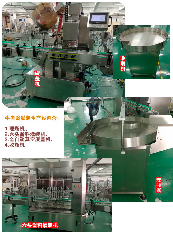 牛肉醬灌裝生產(chǎn)線|牛肉醬真空灌裝生產(chǎn)線是我們北京星火廠家在參考國(guó)內(nèi)外同類產(chǎn)品基礎(chǔ)上進(jìn)行改良設(shè)計(jì)出的一款針對(duì)醬料灌裝的設(shè)備,它結(jié)合生產(chǎn)需要組成了生產(chǎn)線更加的提高了生產(chǎn)效率,醬料灌裝旋蓋生產(chǎn)線,使用更加的穩(wěn)定,自動(dòng)化強(qiáng)度更高,是目前較為理想的醬料灌裝旋蓋產(chǎn)品。 當(dāng)下都講究高端大氣上檔次,所以這款設(shè)備在顏值和實(shí)用方面完全滿足了當(dāng)代人們的理想化要求,選擇我們北京星火廠家的牛肉醬灌裝生產(chǎn)線也許是正確的選擇!設(shè)備細(xì)節(jié)展示: